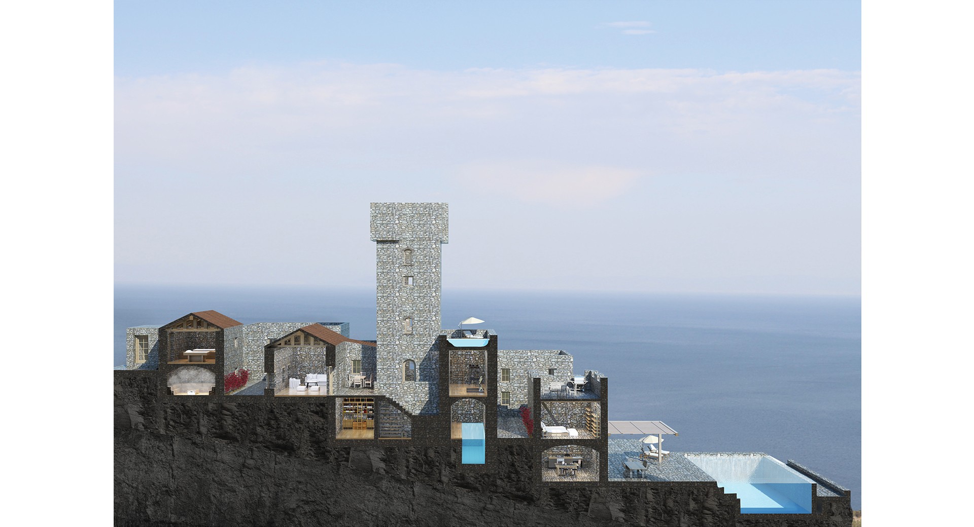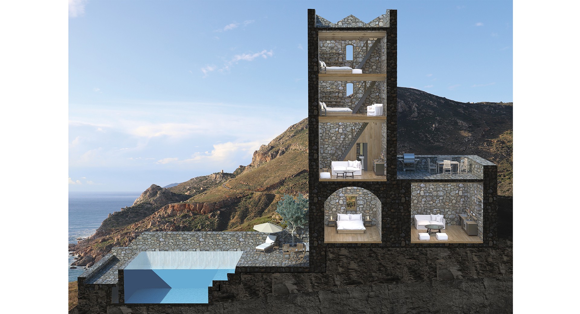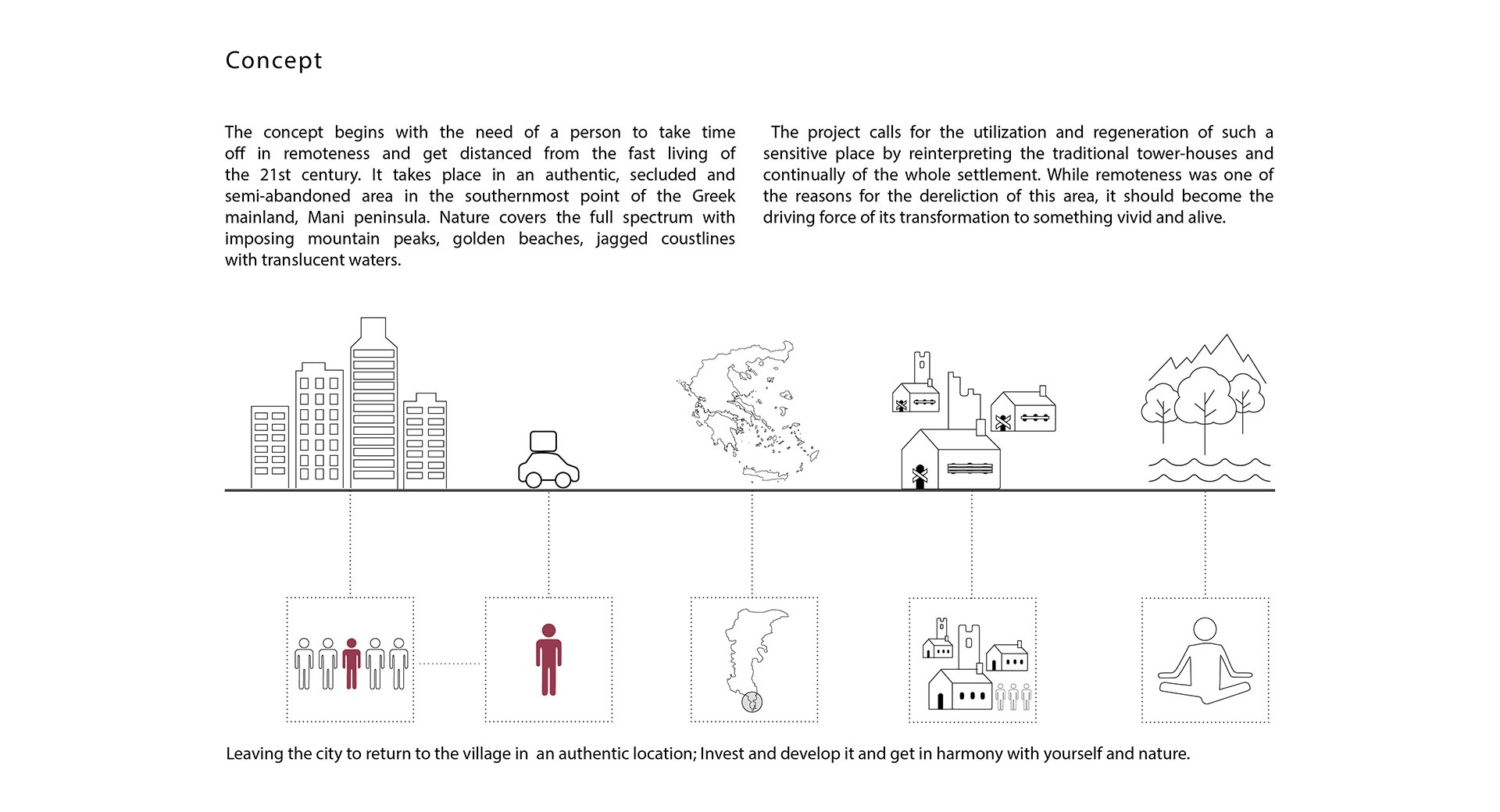 The concept starts with the need of a person to take time off in remoteness and get distanced from the fast living of the 21st century. It takes place in an authentic, secluded and semi-abandoned area in the southernmost point of the Greek mainland, Mani peninsula. Nature covers the full spectrum with imposing mountain peaks, golden beaches, jagged coastlines with translucent waters.
