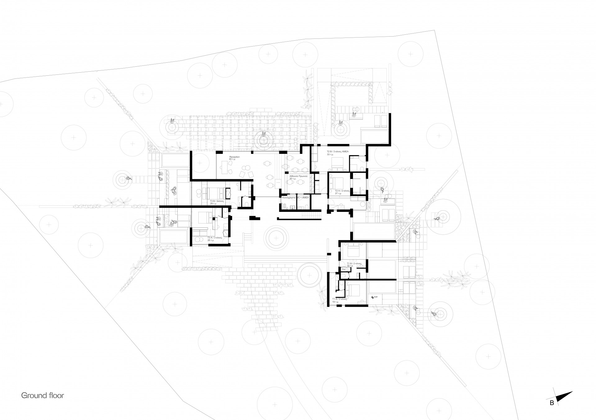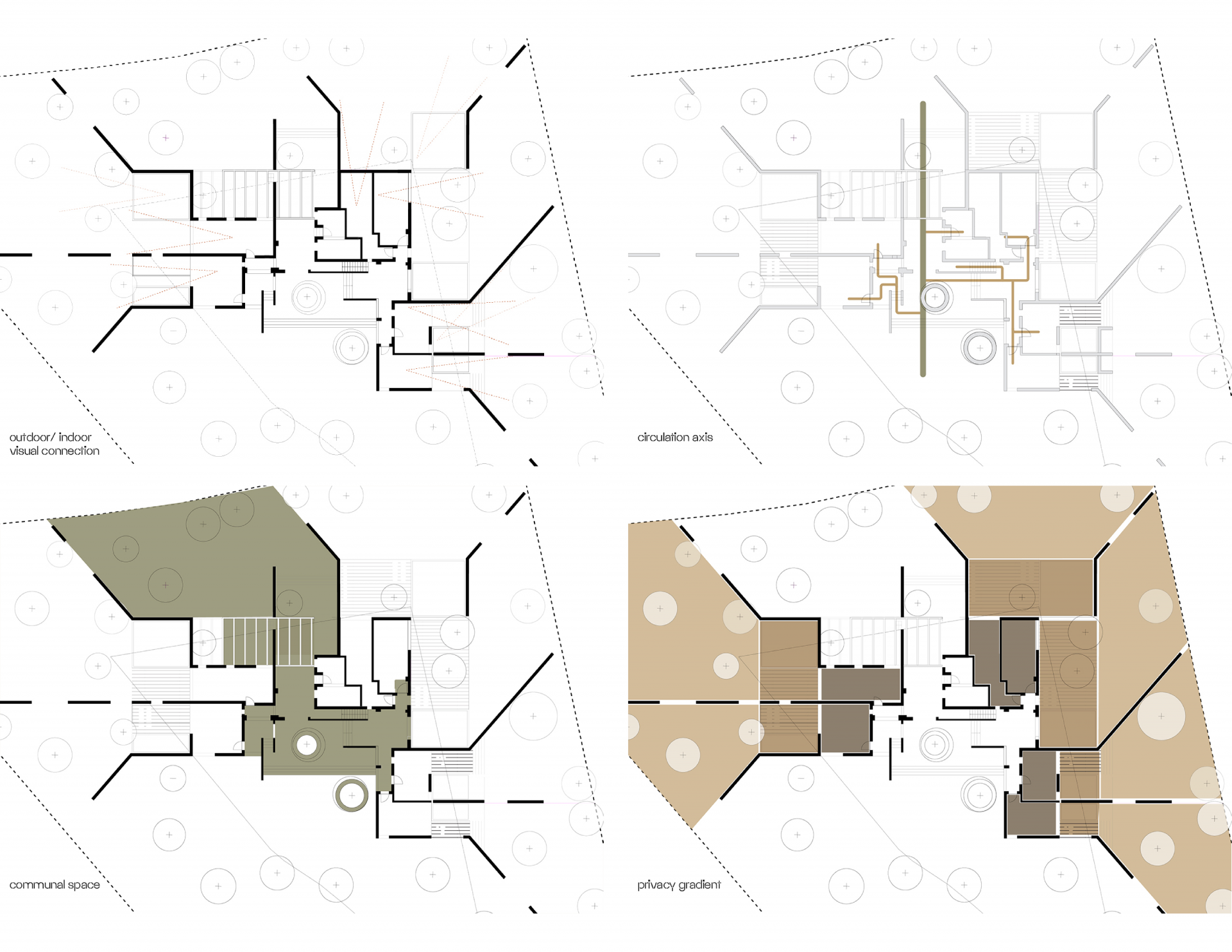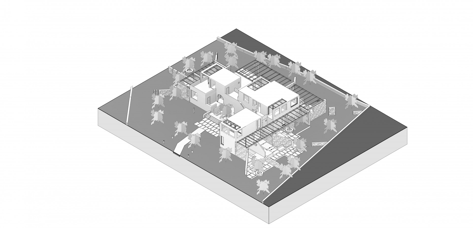 One of the most important aspects of this project were the 150 olive trees growing across the plot. We incorporated them in our design both for tessellation purposes, using them as natural barriers between courtyards, as well as, for organizing personal gardens and intimate spaces around them.
